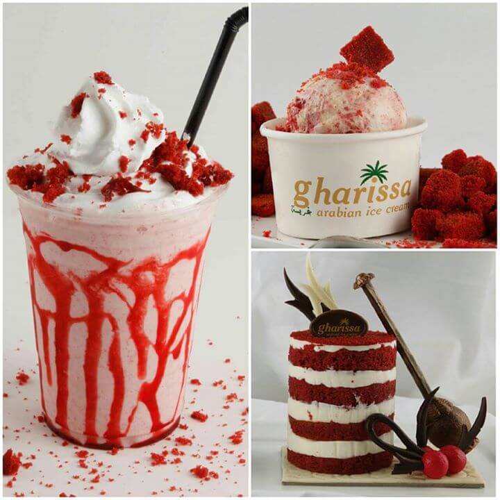 Enjoy Red Velvet Icecream in the Arabian-style at Gharissa – you can also order Red Velvet Cake and Red Velvet Milkshake.