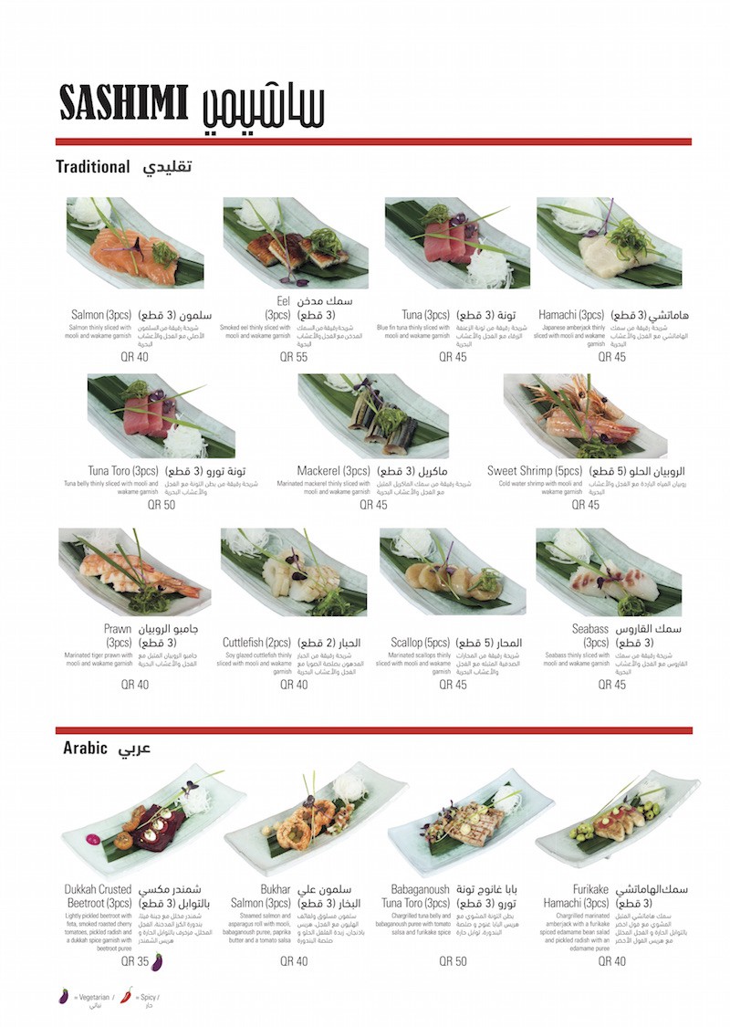 Most menu items are traditionally Japanese but the Arabic Sushi is a nice twist. The Arabic Sushi Rolls have been inspired by local flavours. Diners can choose from varied offerings including Shrimp Biryani, Lamb Maklouba, Chicken Makbous and Daoud Basha. Vegetarian and spicy options are clearly indicated on the menu.